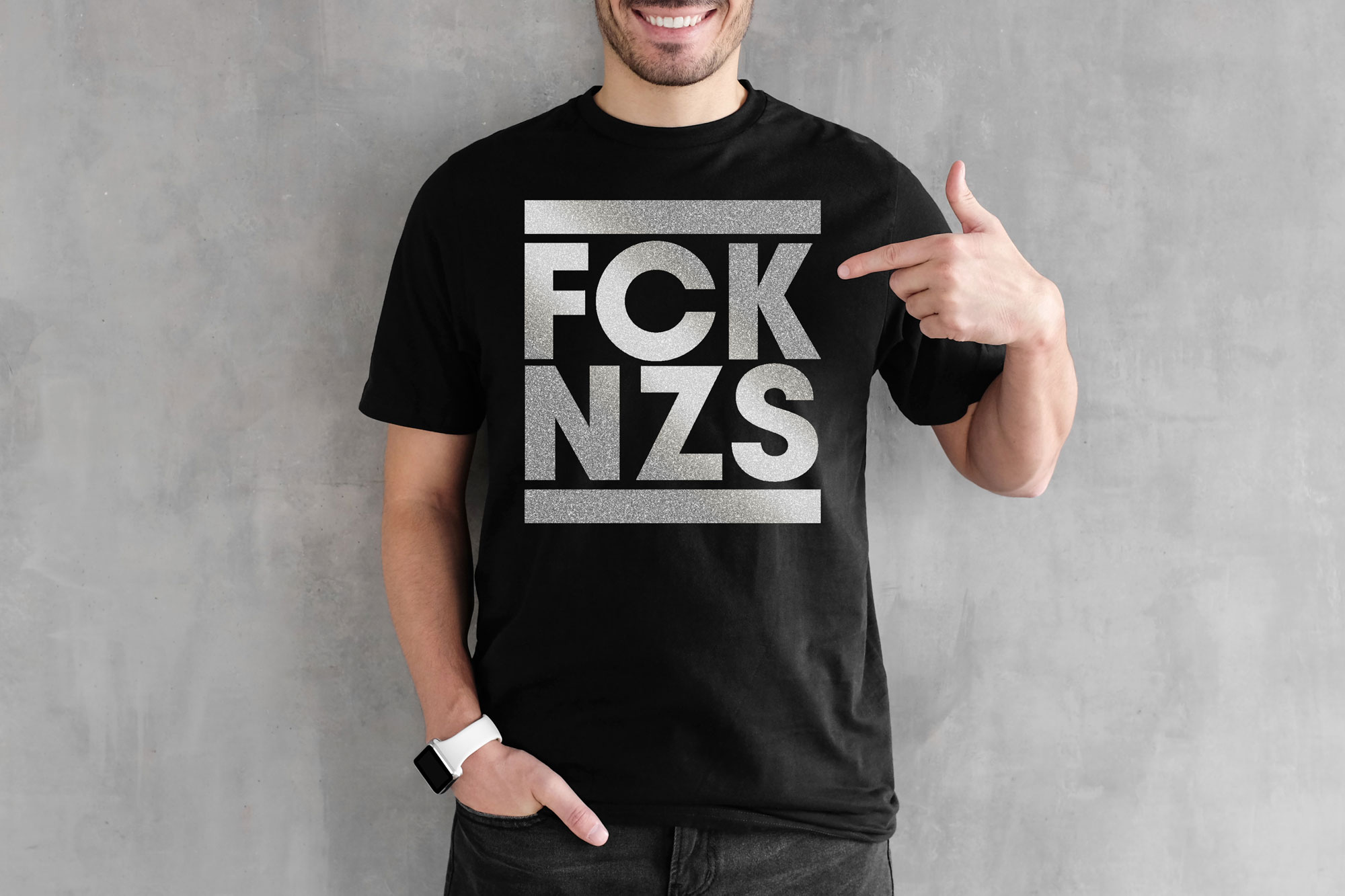 Antifaschistisches Schmuckshirt mit der lichtreflektierenden Aufschrift “FCKNZS”.